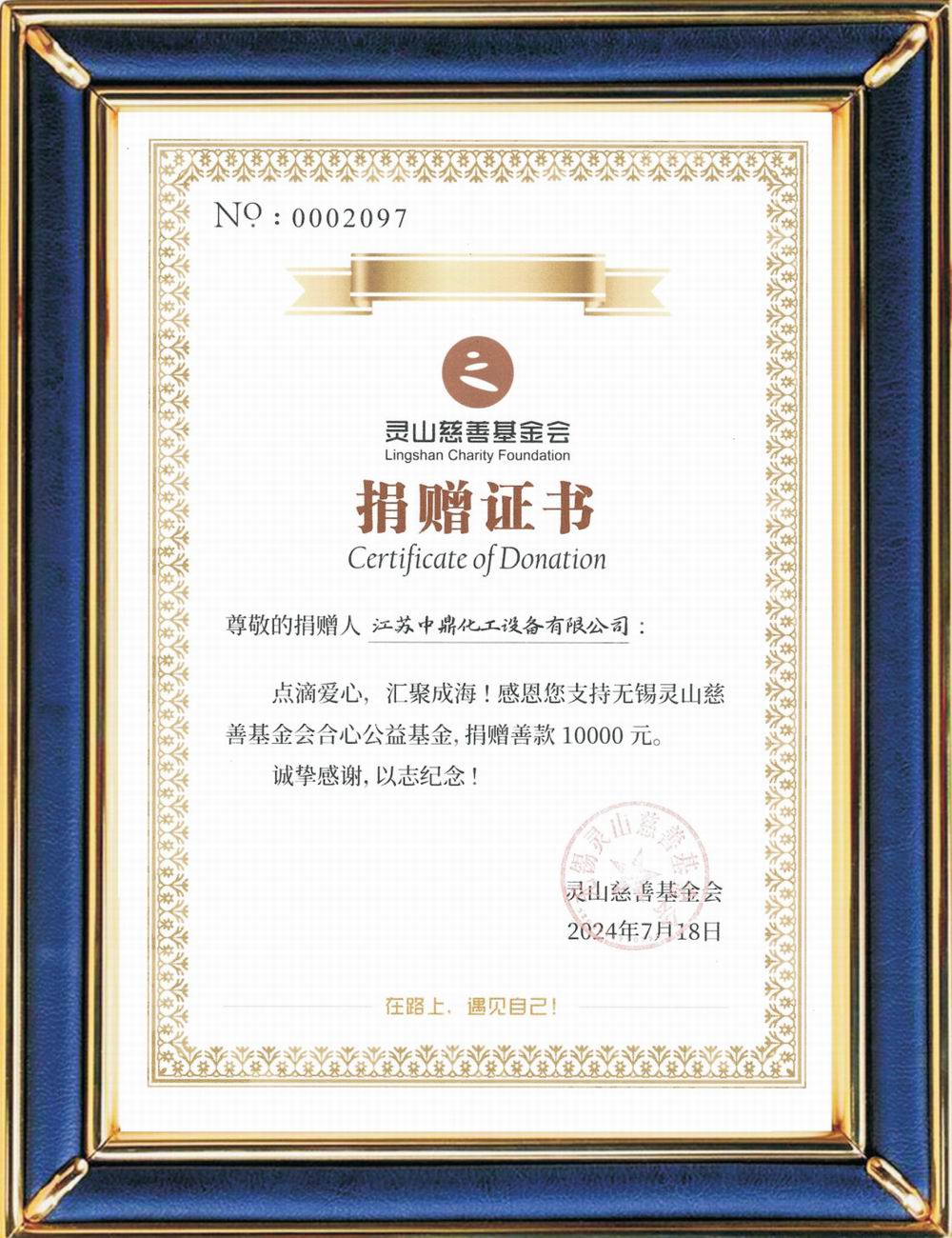 靈山慈善基金會(huì)捐贈(zèng)證書