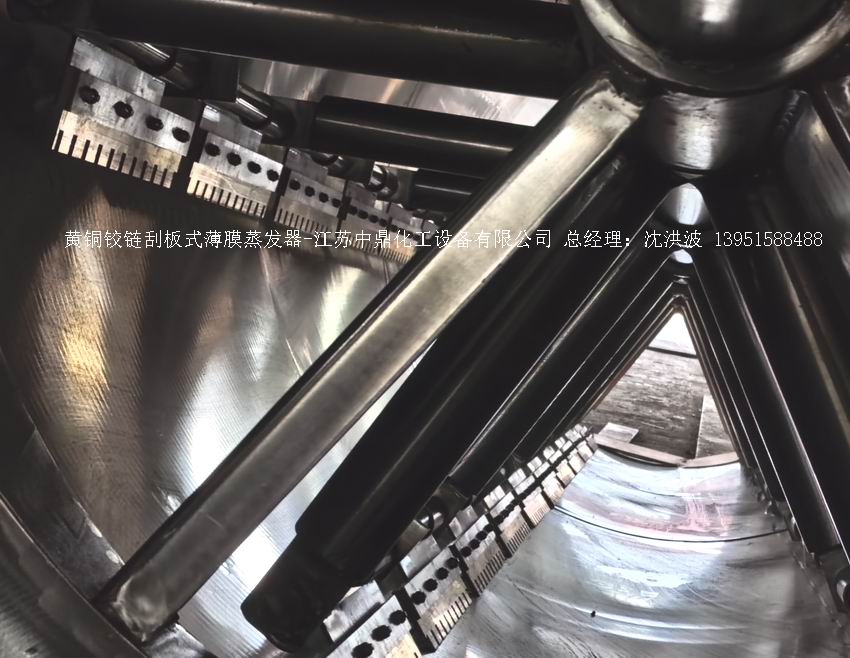 夾套內(nèi)或者外盤半管內(nèi)通加熱的熱源,刮板裝在可旋轉(zhuǎn)的軸上,刮板和加熱夾套內(nèi)壁保持很小間隙,通常為0.5~1.5 mm。在旋轉(zhuǎn)時通過離心力,使刮板與內(nèi)壁緊密接觸。把物料從壁上刮下。料液經(jīng)預(yù)熱后由蒸發(fā)器上部進(jìn)料口沿切線方向噴進(jìn),通過液體分布器分散盤把液體均勻分布到蒸發(fā)器筒體表面,在重力和旋轉(zhuǎn)刮板的作用下,均勻分布在蒸發(fā)器內(nèi)壁形成下旋薄膜,并在下降過程中不斷被蒸發(fā)濃縮,完成液由底部排出,二次蒸汽向上從頂部倉逸出(一般通過真空泵抽出)二次蒸汽再通過汽液分離器、冷凝器處理。在某些場合下,這種蒸發(fā)器可將溶液蒸干,在底部直接得到固體產(chǎn)品。這類蒸發(fā)器的缺點(diǎn)是結(jié)構(gòu)復(fù)雜制造\安裝和維修工作量大。