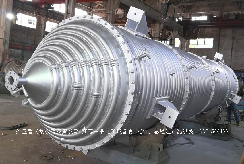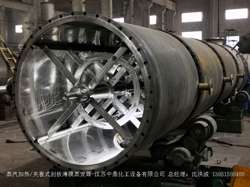江蘇中鼎化工設(shè)備有限公司--離心式刮板薄膜蒸發(fā)器主要由加熱外盤半管式夾套(半管夾套內(nèi)走蒸汽,導(dǎo)熱油,熔鹽或者熱水等循環(huán)給蒸發(fā)器外壁加溫,通過熱傳導(dǎo),把蒸發(fā)器內(nèi)壁形成的物料薄膜中的水份蒸發(fā)減少,提高物料的濃度百分比。一般設(shè)計壓力為0.3mpa~2.5mpa左右,