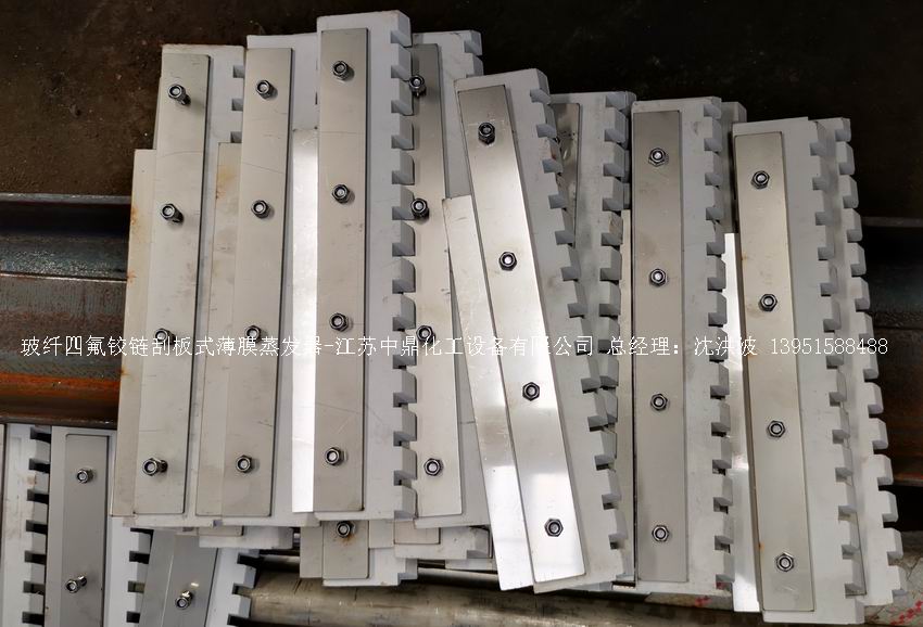 刮板也稱刮刀(刮板分為:玻纖四氟刮板、碳纖維四氟刮板、石墨四氟刮板、黃銅刮板、合金鋼等)和傳動(dòng)裝置:電機(jī)(普通變頻電機(jī)、防爆變頻電機(jī)、高速變頻電機(jī)),減速機(jī)(擺線針輪減速機(jī)、齒輪減速機(jī)),機(jī)架,軸封系統(tǒng)(單端面機(jī)械密封、雙端面機(jī)械密封、磁力密封等,如果抽真空必須選用雙端面機(jī)械密封或者磁力密封),轉(zhuǎn)動(dòng)軸、汽液分離裝置、液體分布器、蒸發(fā)器轉(zhuǎn)子支架、軌道刮板槽、底部軸套等部件組成。